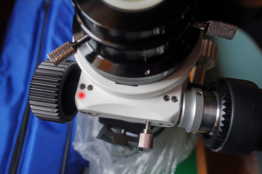 In the packaging, the angle finder is aligned in the same way as the finder holder (see photo on the left). However, as the finder shoe is at an angle of about 45°, the angle finder must be rotated in the finder holder so that it points vertically upwards. However, this did not work for me at first because the viewfinder is locked in the holder by a rubber ring. You therefore first have to push the finder forwards to push the rubber ring out of the holder, then turn the finder accordingly and finally push it back again so that the rubber ring can lock in place again. Sounds more complicated than it is, but it probably has to be repeated every time the angle finder is used, as does the adjustment of the finder. This is of course cumbersone! In the case that the refractor is to be used on the AZ5 mount head, the finder has to be turned in the same direction, because the refractor has to be turned in its tube clamps. The easiest way is probably to leave the viewfinder rotated and no longer pack it in its box...