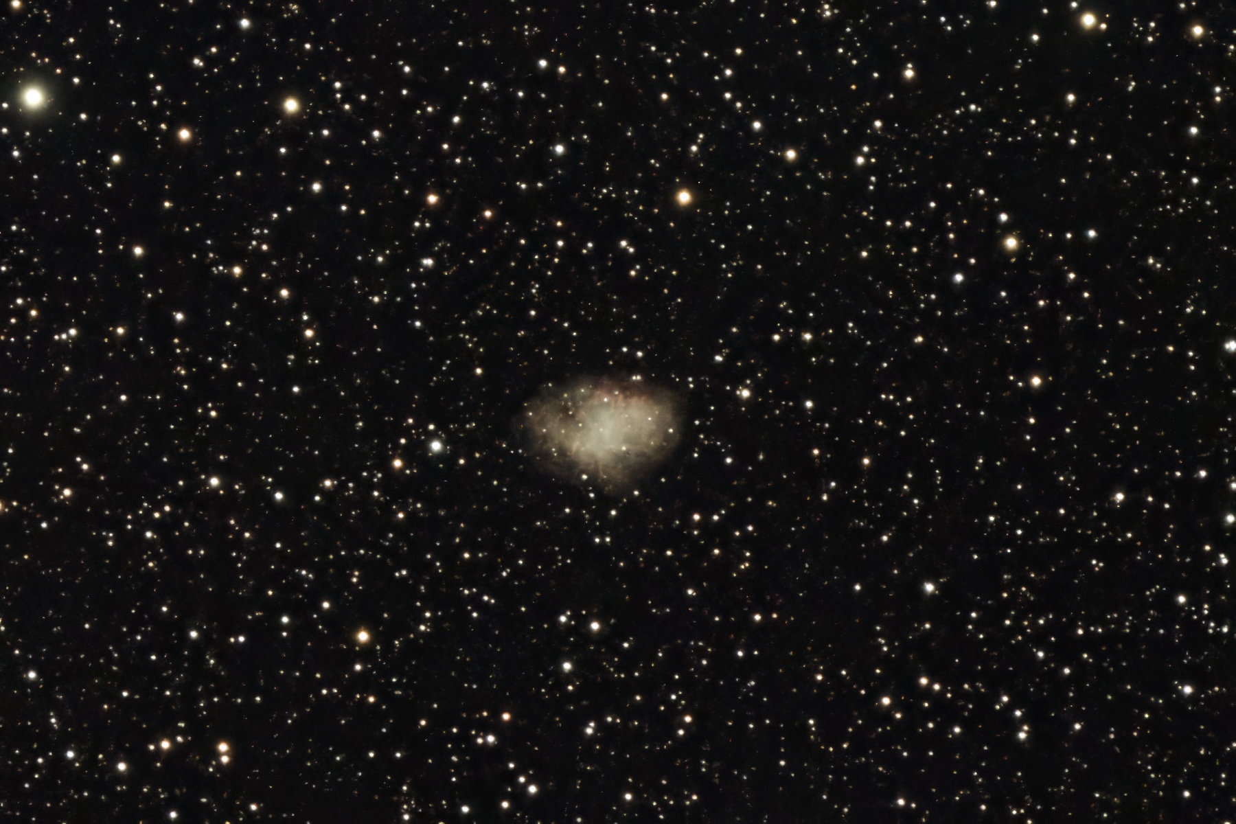 Taurus / Bull is another constellation that I only knew by its name. Thanks to the Hyades (Mel 25), it has now become more familiar to me - at least its star Aldebaran, which glares conspicuously yellow (or golden). While the Hyades are at the center of Taurus, the galactic emission nebula M 1 (NGC 1952), also known as Crab Nebula, is located at its left end and slightly above the end star zeta Tauri. It is famous for being a supernova remnant from 1054.