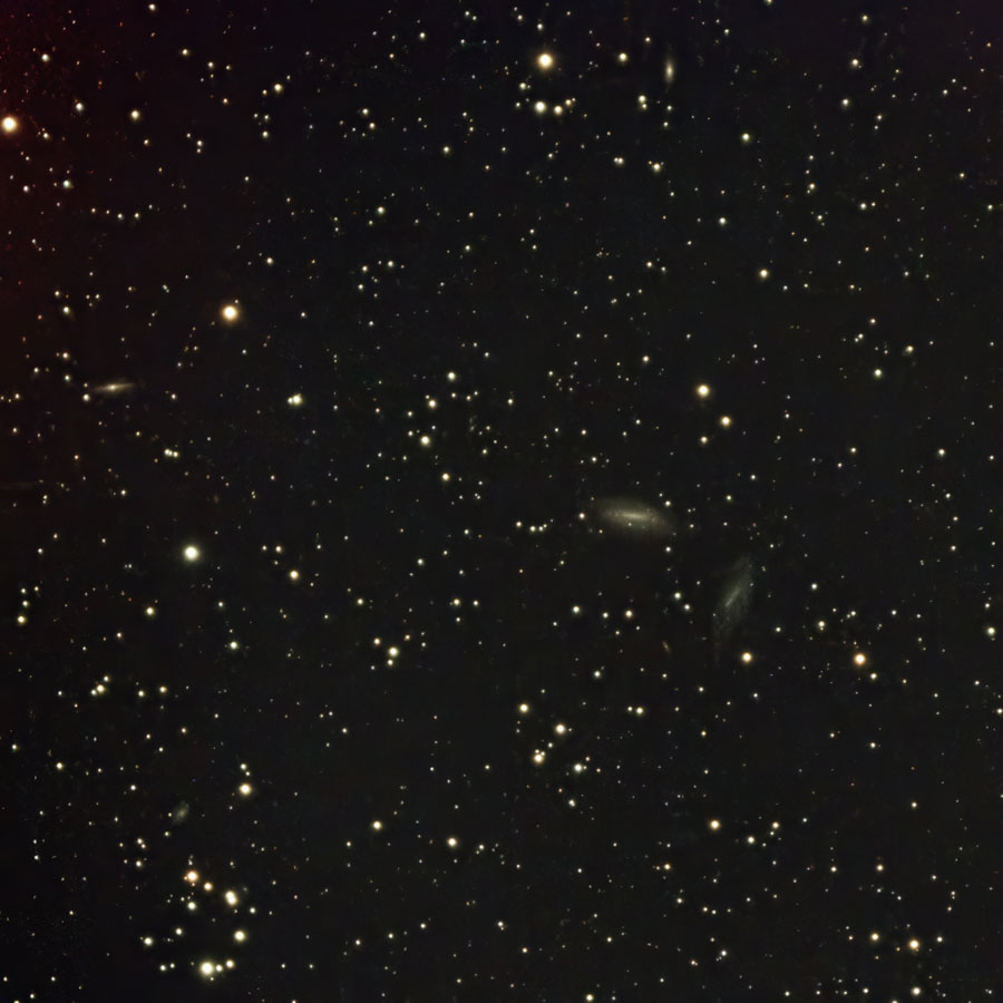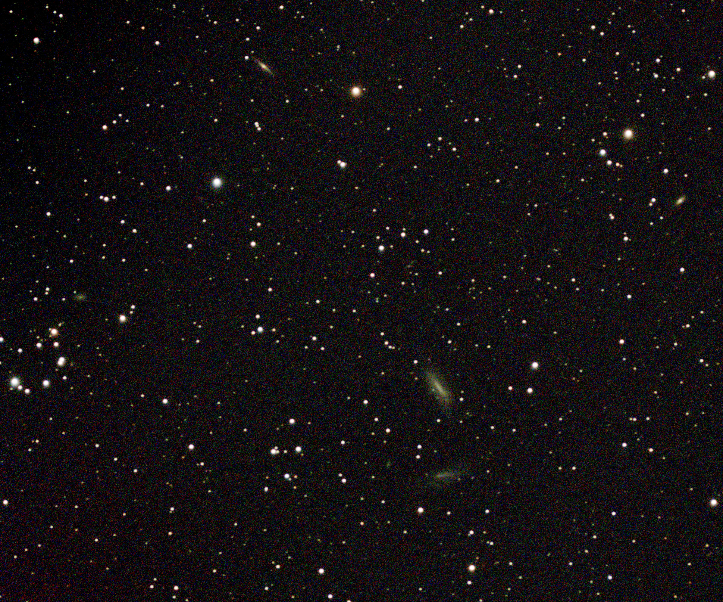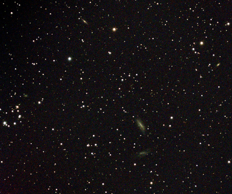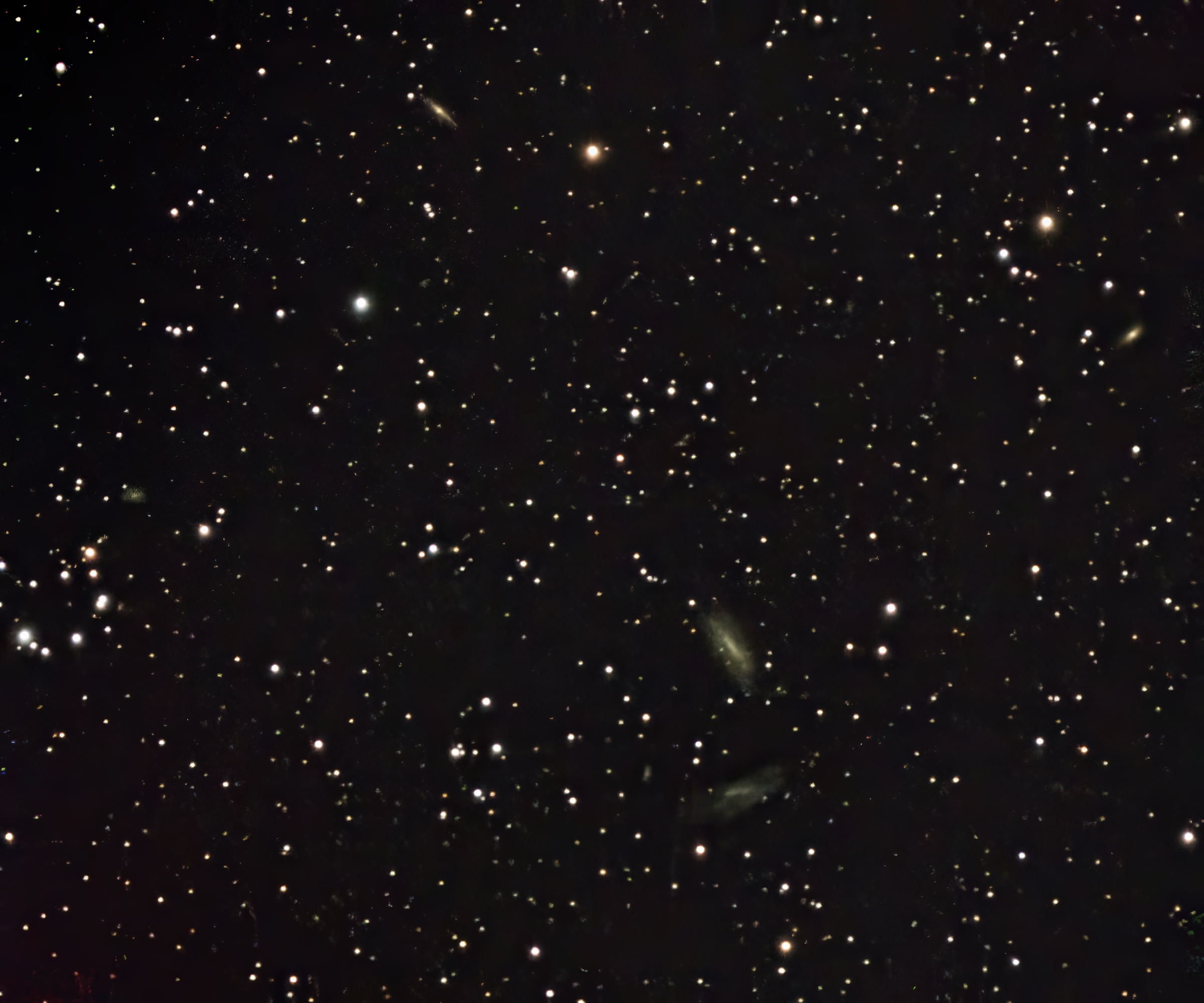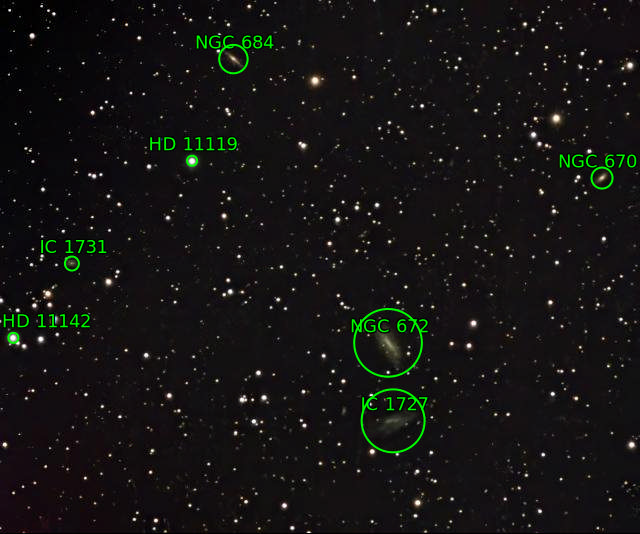 Three more galaxies can be seen on my Vespera Pro photo: NGC 670 (lenticular galaxy), NGC 684 (edge-on spiral galaxy) und IC 1731 (barred spiral galaxy) ; these three galaxies form the galaxy trio LGG 32.