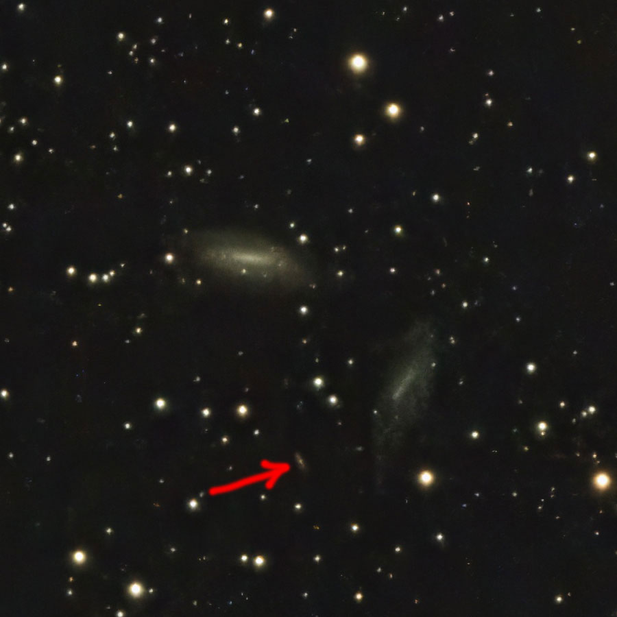 NGC 672 and IC 1727 - Nov 22, 2025, 2000 (280 frames = 46 min), 1:1 section, processed and denoised (TP); the arrow points to the galaxy PGC 1803573 |