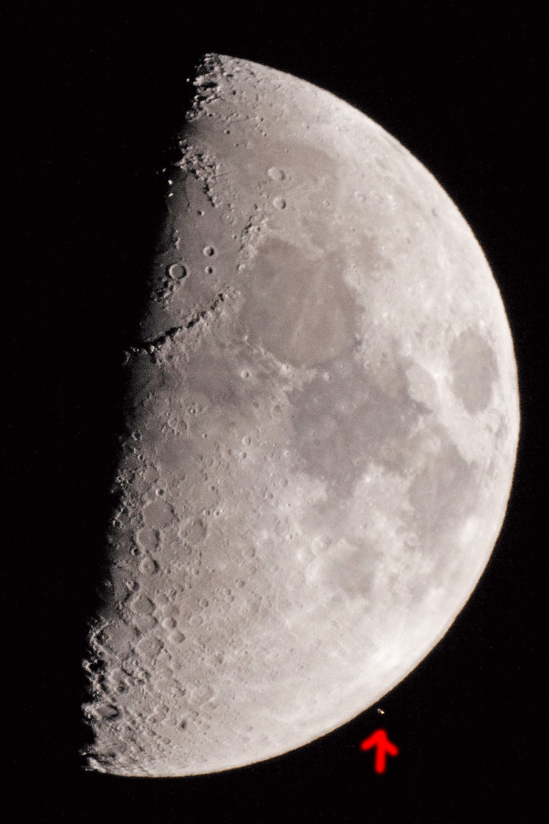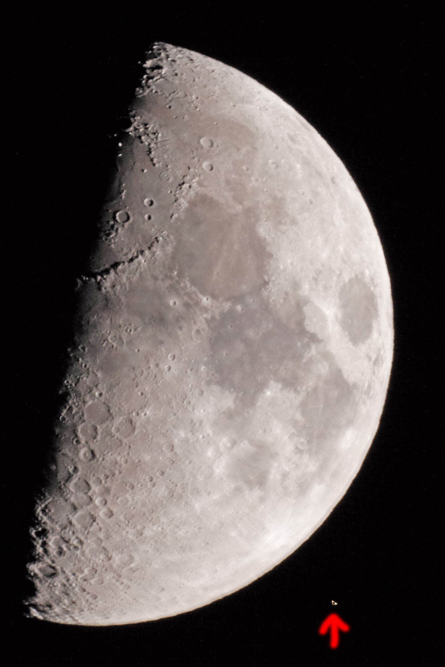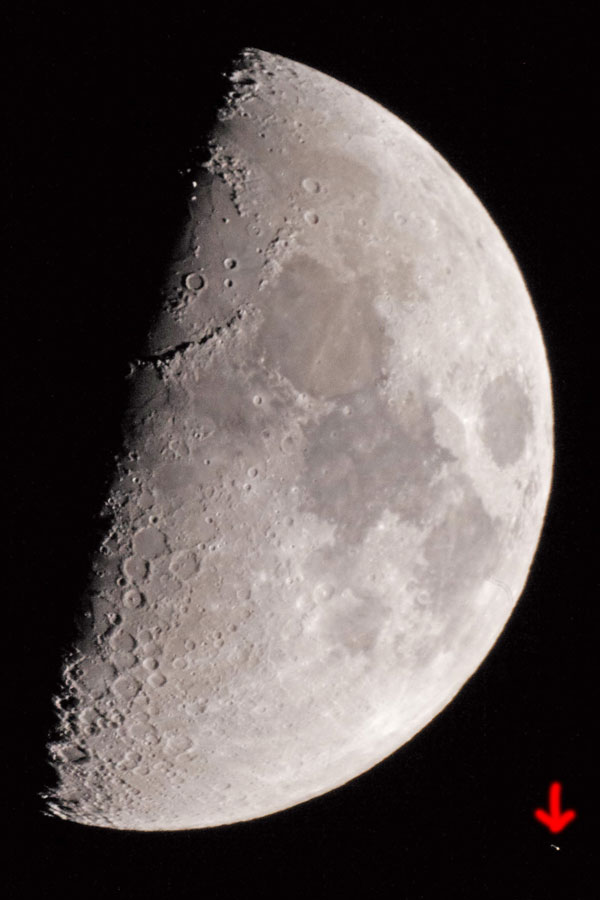Here are the first "photo-sightings" on the bright side of the moon (approx. 18:50 o' clock) in 200% magnification (the caprioles of Aldebaran are to be owed to the camera and the photographer):