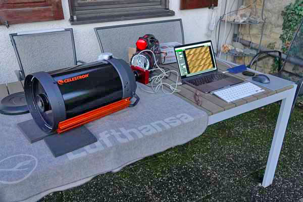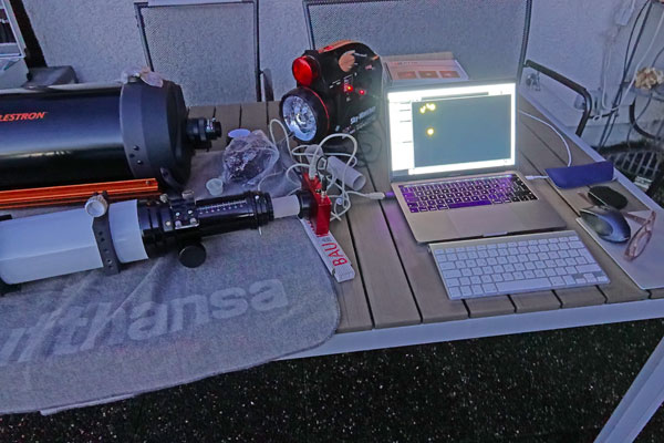 Am 9.2.2020 habe ich mein C8 mit Fokalreduzierer (f/6,3) auf der Star Discovery-Montierung "informell" aufgebaut und die Kamera einerseits am Teleskop und andererseits am Computer angeschlossen. Dabei wollte ich eigentlich mit Tageszielen testen, ob die Kamera mit dem Fokalreduzierer in den Fokus kommt und wenn ja, unter welchen Randbedingungen. Am neuen Laptop, der nur noch USB-C-Anschlüsse hat, wurden Adapter für das USB-Kabel benötigt. Zunächst, als ich einen steckerartigen USB-A-auf-USB-C-Adapter verwendete, wurde die Kamera überhaupt nicht erkannt. Als ich auf ein "Mini-Dock" wechselte, wurde die Kamera schließlich erkannt. Generell ist das Erkennen der Kamera immer wieder ein Problem, weil ich Windows auf einem MacBook unter Parallel Desktop betreibe.