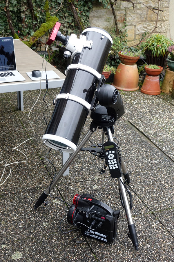 | Ansicht der vollständigen Ausrüstung einschließlich PowerPack (für die Montierung und die Kamera) und Laptop-Computer (für die Atik Infinity-Software) | ||