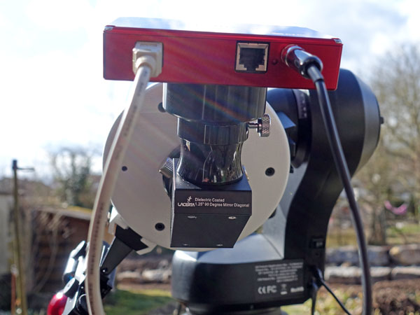 Die Atik Infinity-Kamera kann am Skymax-127 betrieben werden. Aber wegen der langen Brennweite des Skymax-127 und seines kleinen Öffnungsverhältnisses (1500 mm, f/11,8), empfiehlt sich ein Brennweitenreduzierer (siehe oben). Ich habe diese Kombination mit einem 2-fach TS-Brennweitenreduzierer und einer 2,5 cm-Verlängerungshülse getestet (nominal 3-fach, aber 2,31-fach in der Praxis). Hier wird die Kamera ohne Brennweitenreduzierer gezeigt!