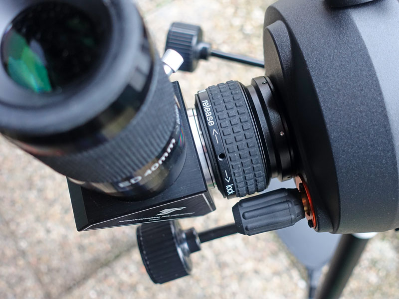On the C5, a normal SC zenith mirror for 2" accessories could also be used instead of a 2" zenith mirror (via ClickLock clamp). Unlike the C8, the SC zenith mirror does not collide with the focuser at the C5, which I would have expected. But the ClickLock clamp is, of course, the more convenient solution...