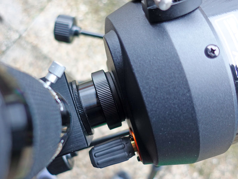 In astronomy forums, I came across discussions in which the question was raised, whether 2" accessories can be meaningfully used on the C5. In the end, I have not been able to find a clear answer - actually it is "no". Despite this answer, some posters decided to buy 2" accessories. So I thought I would give it a try myself, since I have 2" accessories available from my C8 (and from my refractors). However, I failed after only a few turns: the Baader ClickLock adapter cannot be screwed onto the SC thread at the tube, because the locking lever of the adapter bumps against the focusing knob of the C5.