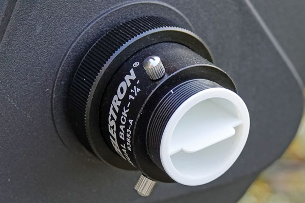Here, the focuser more or less hits the eyepiece sleeve of the zenith mirror - the SC adapter is only a little less than 4 cm long. |