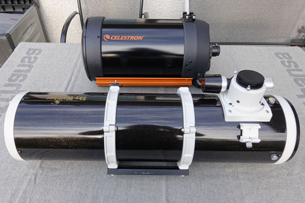 The star friend owning the LX200 uses this on his Star Discovery mount, however, in the Orion version, which can carry 6 kg, at least on paper. But according to my astronomy dealer Mr. Kloß, the Orion version is identical to the Sky-Watcher version. This at least "suggested" that the C8 might also be used on my mount. In September/October 2019, I borrowed a Sky-Watcher StarTravel 120/600 from another star friend. We met for returning the refractor at the Stromberg hill and wanted to compare his C8, with which he is very satisfied, with my 6" Newton tube. Unfortunately, the upcoming clouds prevented this! At least, I was able to "weigh" the C8 and put it on my Star Discovery mount. There it seemed to be usable without any problems (at least, no more problems than with my 6" Newton tube, which has a similar weight but is longer).
