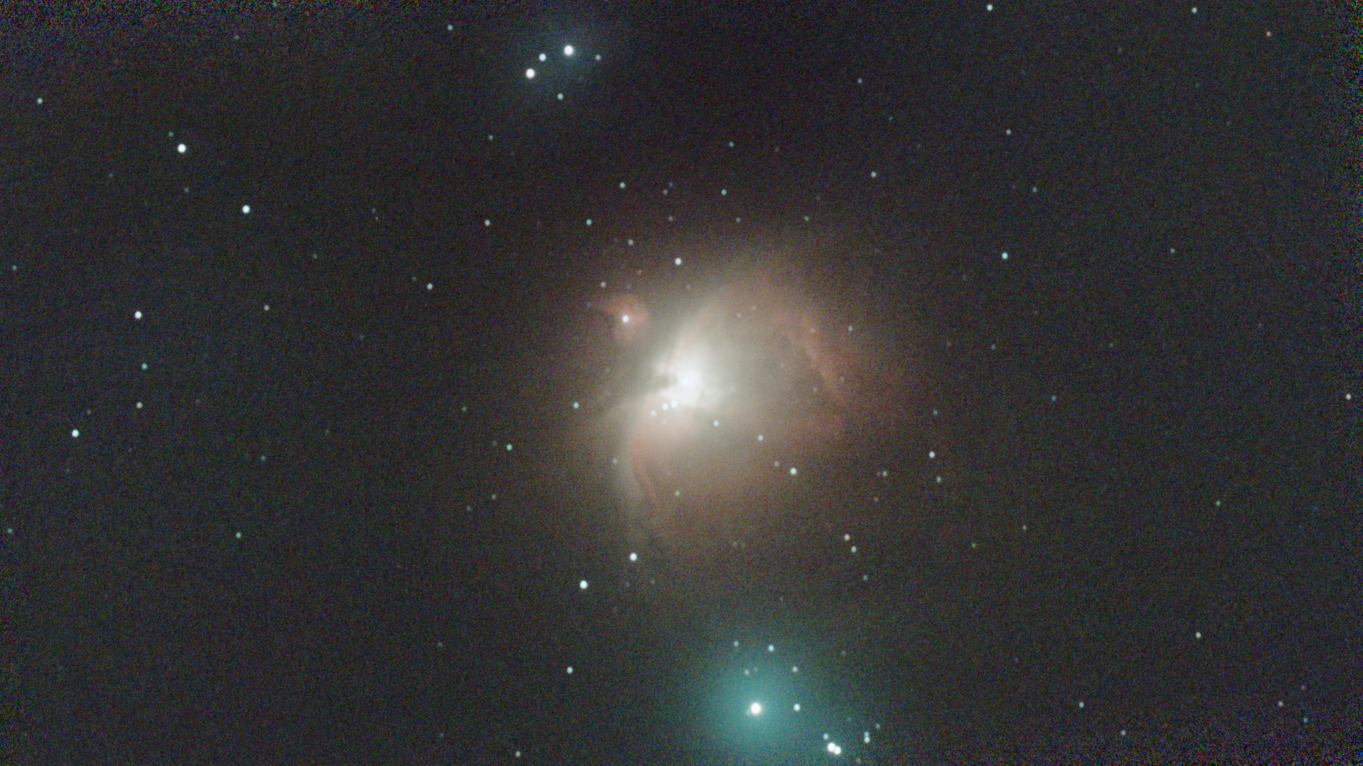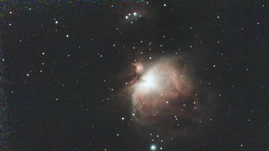 - Kurz vor 21 Uhr Neustart mit M 42/43 (15 s, G 60, DuoBand-Filter); nach 150 Aufnahmen (37,5 min) um 21:44 Uhr beendet; Nebel, Foto ziemlich verwaschen, aber es waren auch Wolken in der Gegend...