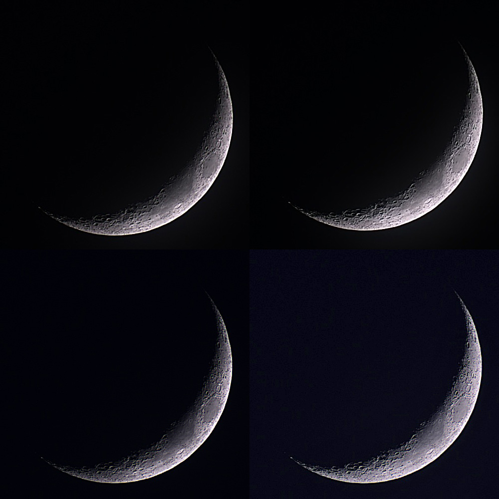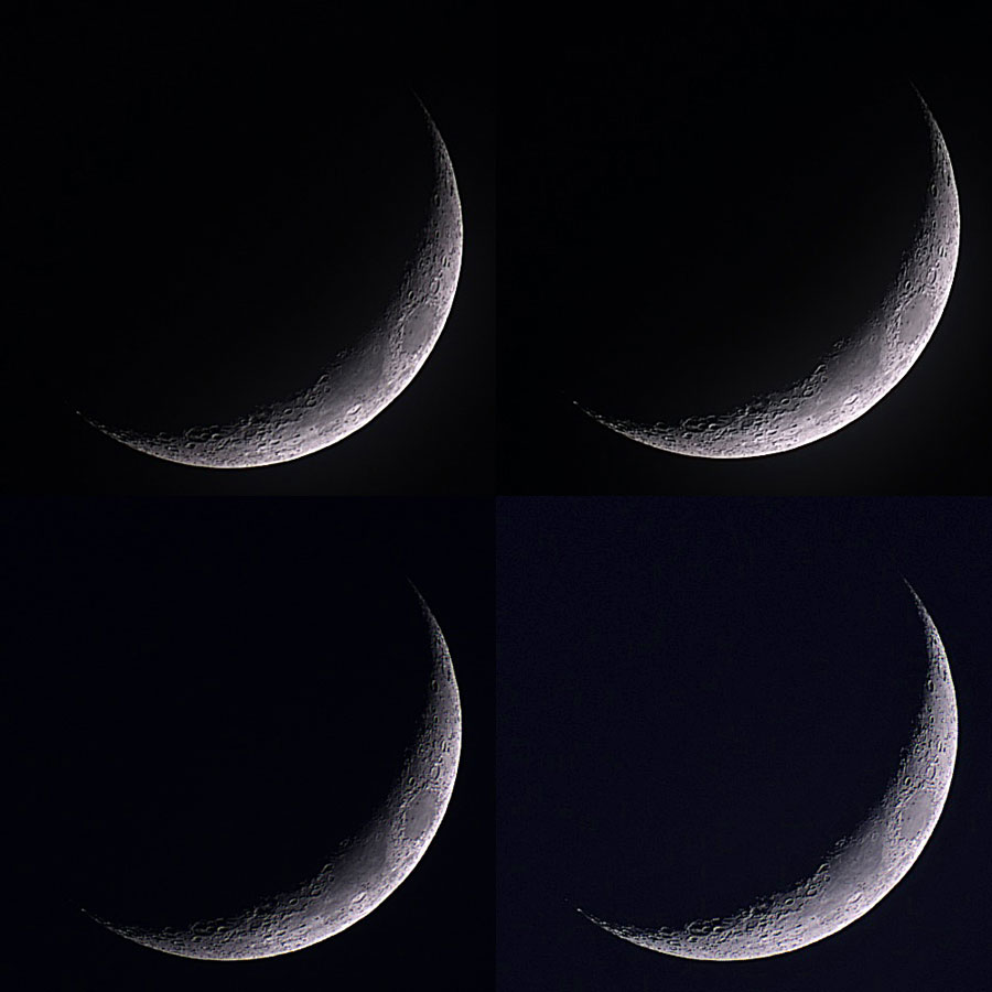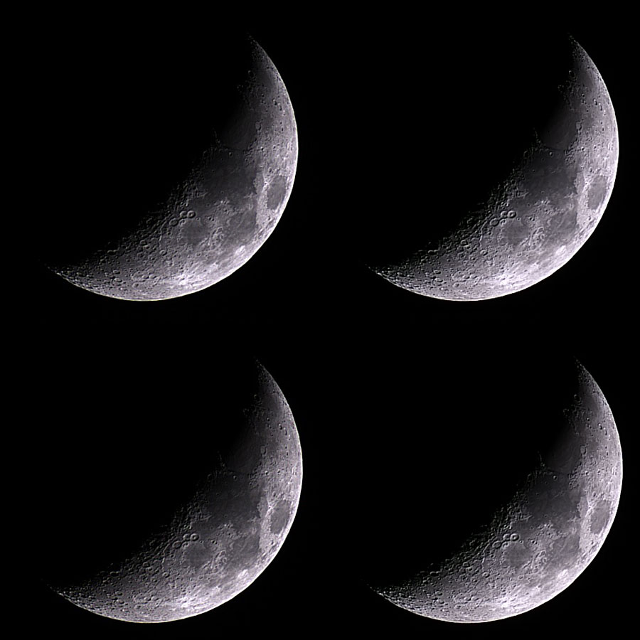 Sichelmond: Oben 50 Fotos gestapelt, rechts mit Stellar Studio nachbearbeitet; unten 20 Fotos gestapelt, rechts mit von mir aufgehellt (Adobe PSE).
