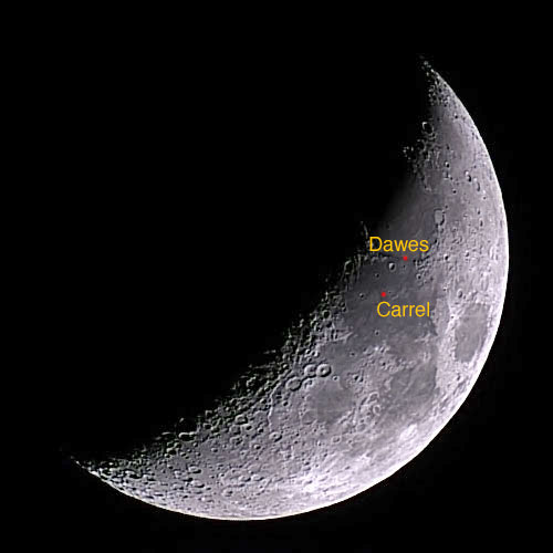 Der Krater Dawes ist 18x18 km groß und sieht etwas unregelmäßig aus (unter dem roten Punkt); Carrel ist 17x16 km groß und bei starker Vergrößerung sieht man genau ein dunkles Pixel und etwas Gemauschel drumrum (rechts vom roten Punkt).