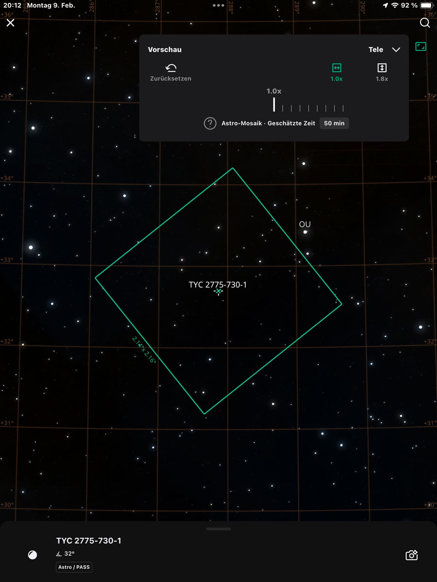 The Dwarf mini's mosaic mode works completely differently than that of Vaonis: several "panels" are simply recorded, which are later stitched together and post-processed using Stellar Studio. You only get a so-called "preview" that still shows seams at the overlaps (this should change at some point in time...). Because of the overlap of the panels, only a factor of 1.8 is achieved instead of a factor of 2. According to my first experiences, joining the panels in Stellar Studio works very well - at least when it is available. I also had the case that Stellar Studio did not want to work due to server problems in China...