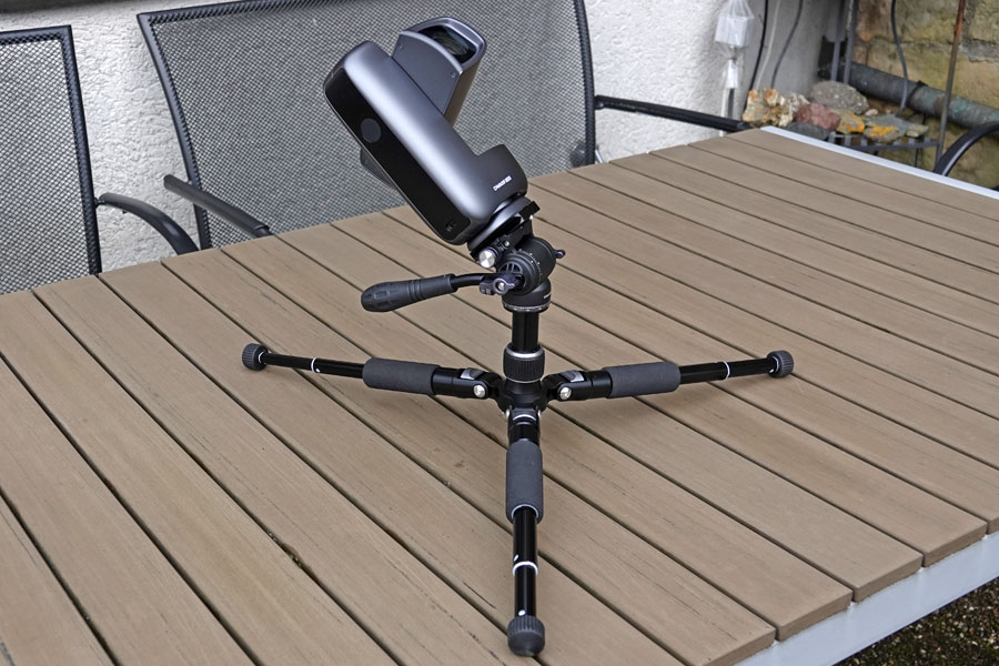 Insofern habe ich es hinterher als ganz praktisch empfunden, dass ich das Stativ gleich mitbestellt habe... Im AZ-Modus kann das Dwarf mini allerdings auch gut ohne Stativ betrieben werden, wenn man es auf einen Tisch oder auf den Boden stellen kann.