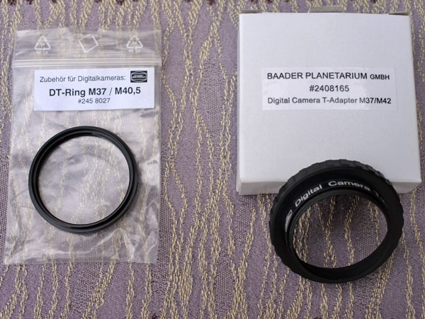 Left: Baader DT ring adapter M37/M40.5 (#2458027); right: Baader digital camera T mount adapter M37/M42 (#2408165) - Ricoh CX1 |