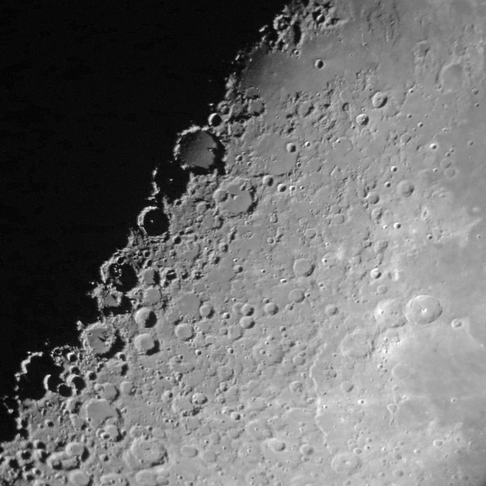 This section from a photo of the moon that was taken with the Sky-Watcher Explorer 150PDS telescope and the camera held to the eyepiece (March 24, 2018, one day before Half Moon, which took place on March 25, 2018). This photo is also very detailed, and you can even see craters that are below 10 km in diameter.