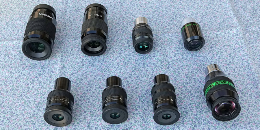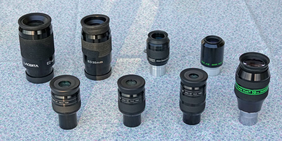 Photos: Top row (from left to right): 40 mm Lacerta ED eyepiece, 35 mm TS UFL ED eyepiece, 32 mm DigiScope Plössl eyepiece, and 24 mm TeleVue wide angle eyepiece; bottom row (from left to right): 16 mm, 7 mm, and 4 mm TS UWA eyepieces, and 10 mm TeleVue Delos eyepiece.
