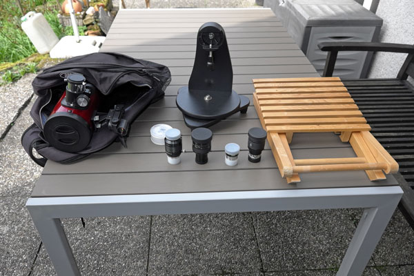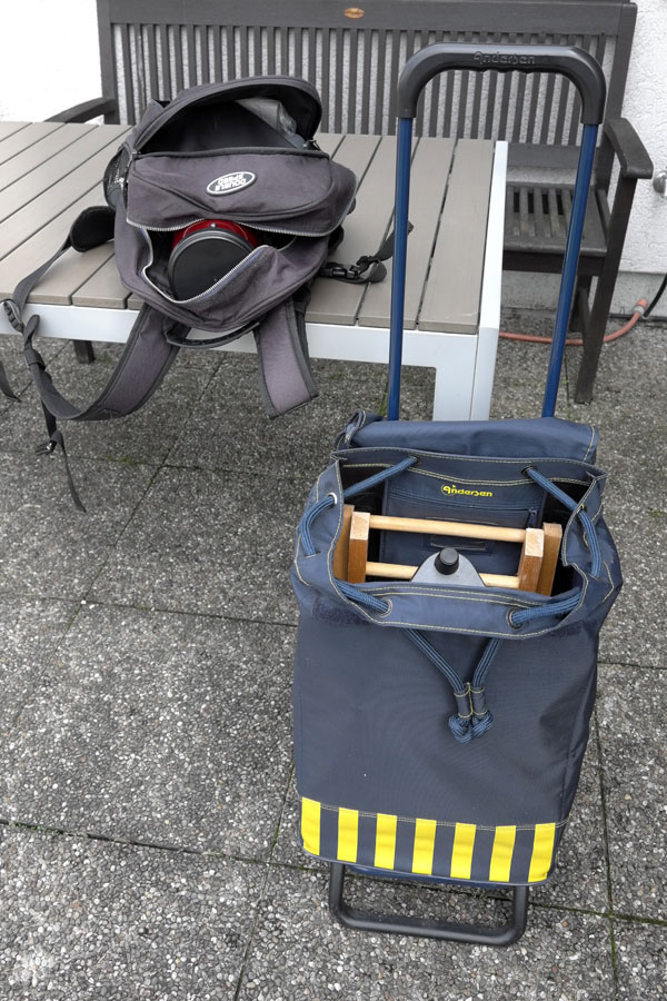 Of course, this immediately raised the question of whether I can actually motivate myself to go on such a walk at night... But before this question can be resolved, I wanted to check whether the preconditions for such an endeavor can been met. So I tried to pack my small telescopes in a backpack and a caddy.
