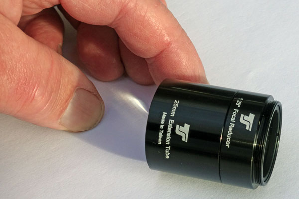 Focal reducers, as the name implies, shorten the focal length of a telescope. Using them actually doubles the number of eyepieces (or triples them for two reducers), but usually and in contrast to Barlow lenses and focal externders, this is not the reason why they are being used. In December 2017, I purchased a simple 2 x focal reducer from TS Optics (1.25"), plus a 1.25" extension sleeve (2.5 cm long) that transforms it into a 3 x reducer (the exact values depend on the distances).
