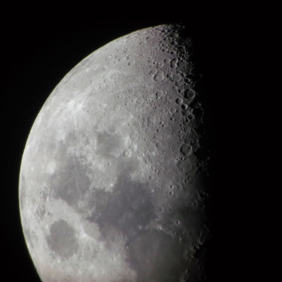 End of July 2015, I made my first attempts in taking photos of the moon with this telescope. The 1:50 method (camera held to the eyepiece) requires many attempts and is frustrating, but the final results are quite OK. However, as with other photo attempts, I did not succeed in achieving uniform sharpness across the image. In April 2016, I took further photos of the moon, but used the projection method this time. Because of the 32 mm eyepiece that I used, the magnification was lower, but the focus seems to be more evenly distributed thanks to the fixed installation of the camera.