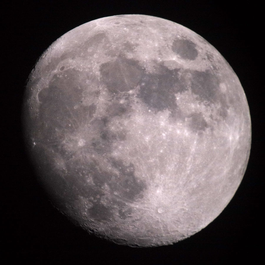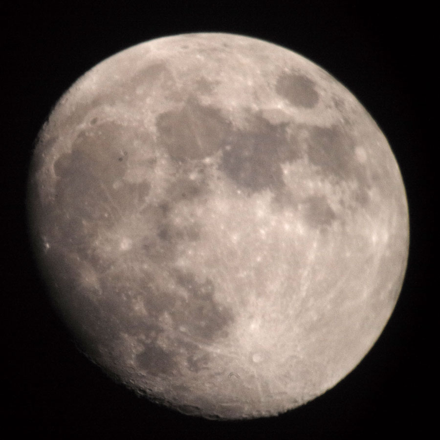 The following photos of the moon were taken on March 29, 2018, two days before Full Moon, using the projections method, that is, with the Sony RX100 M4 attached to the eyepiece. I used ISO 400 and 200 and underexposed EV -2 to avoid blowing the highlights. I used a 32 mm Digiscope eyepiece with T-mount.