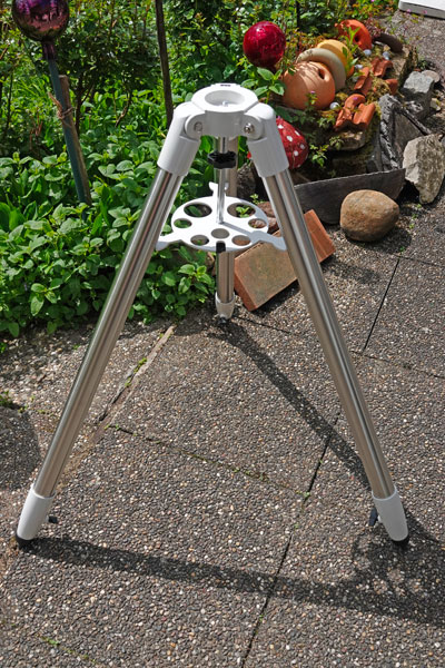 Leider öffnen sich die Beine des AZ5-Stativs nicht ganz gleichmüäßig, so daß die Auflageplatte für Okulare nicht ganz gerade steht. Jedenfalls ist einige Gewalt nötig, um es einigermaßen gerade aufzustellen. Das ist in meinen Augen simpler "Pfusch" von Sky-Watcher!