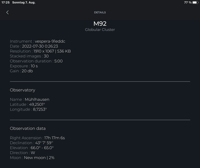 Die wichtigsten "Zusatzinformationen" in den EXIF-Daten der TIFF-Dateien sind neben der Anzahl der Frames/Belichtungsdauer die Außentemperatur und die Luftfeuchtigkeit. Nicht einmal der Filter wird erwähnt, wie ich bei einer Aufnahme mit Filter feststellen konnte. Alles in allem, ist das dürftig, was Vaonis da abliefert! Ansonsten gilt auch hier, dass die Anzahl der gestackten Aufnahmen in den EXIF-Daten um 1 kleiner ist als sie sein sollte.