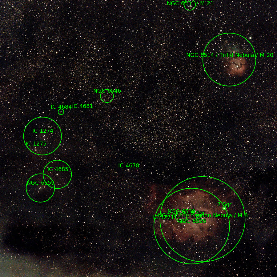**) Further DSO: IC 1271, IC 1274, IC 1275, IC 4678, IC 4681, IC 4684, IC 4685, NGC 6506?, NGC 6526, NGC 6546, NGC 6559, M 21 (NG 6531)