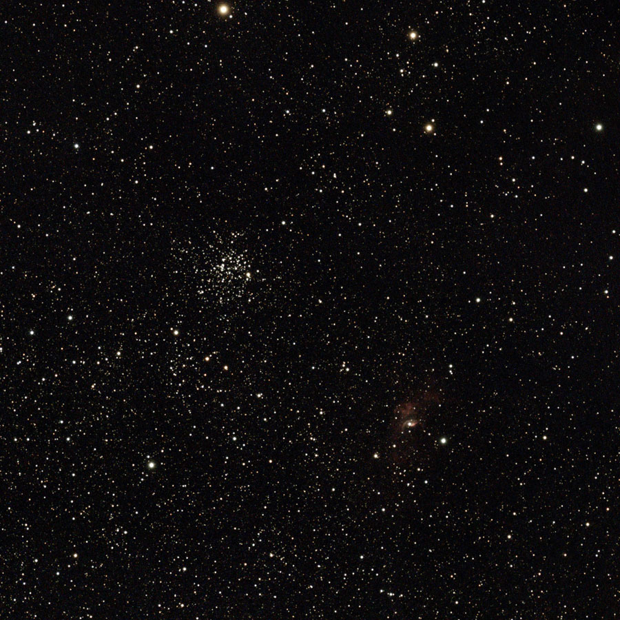 M 46, section from the photo on top with NGC 2438 (red) and CR 5237 (blue, tiny) - 1500, processed |
