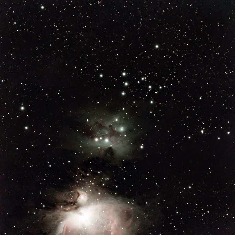 NGC 1981 (top) with NGC 1977 and M 43, Feb 27, 2025 - large (20 min), processed and denoised (PAI) |