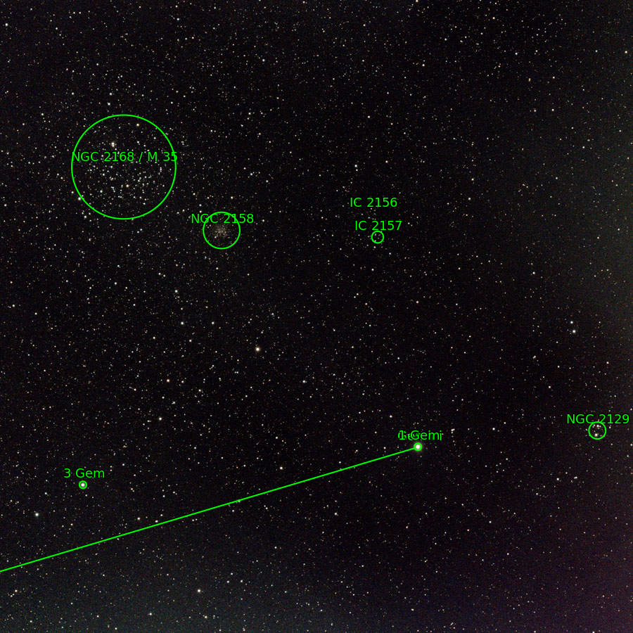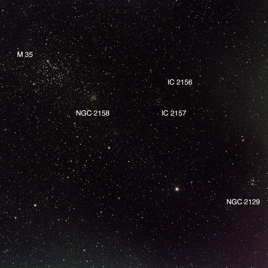 M 35 with NGC 2158 IC 2156/57, NGC 2129, Apr 11, 2025 - ditto with labels |