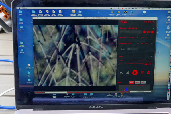 Insgesamt waren die Ergebnisse wenig überzeugend, aber ich war froh, mit der unbekannten Kamera und Kamerasoftware überhaupt etwas gesehen zu haben! Schließlich musste ich zunächst lernen, wie die Kamera mit ASI Live gesteuert werden kann. Dabei ging es um die Belichtungszeit, das Gain (Verstärkung = ISO), die Helligkeitssteuerung für das Bild und nicht zuletzt das Abspeichern der Fotos. Noch sind längst nicht alle Fragen beantwortet!
