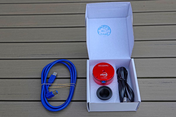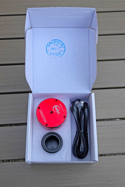 Die Ausrüstung befindet sich nicht mehr im Originalzustand. Ich bin vermutlich der dritte Besitzer der Kamera und verfüge über keinerlei Rechnungen. Laut ZWO-Stempel wurde die Kamera im März 2019 produziert. Die Ausrüstung entspricht bis auf einen Punkt (fehlendes ST4-Kabel*) dem Zustand wie ich die Kamera im April 2021 von einem Sternfreund zunächst geliehen und dann käuflich erworben habe.