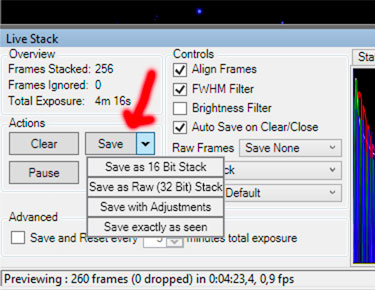 If you click the "Save" button, the current image is saved as a 16- or 32-bit stack (this seems to depend on the format of the dark frames...). If you want to save it as you see it on the screen, select "Save exactly as seen" (the filename will say "WithDisplayStretch"). It would be nicer if one were able to set the default format...