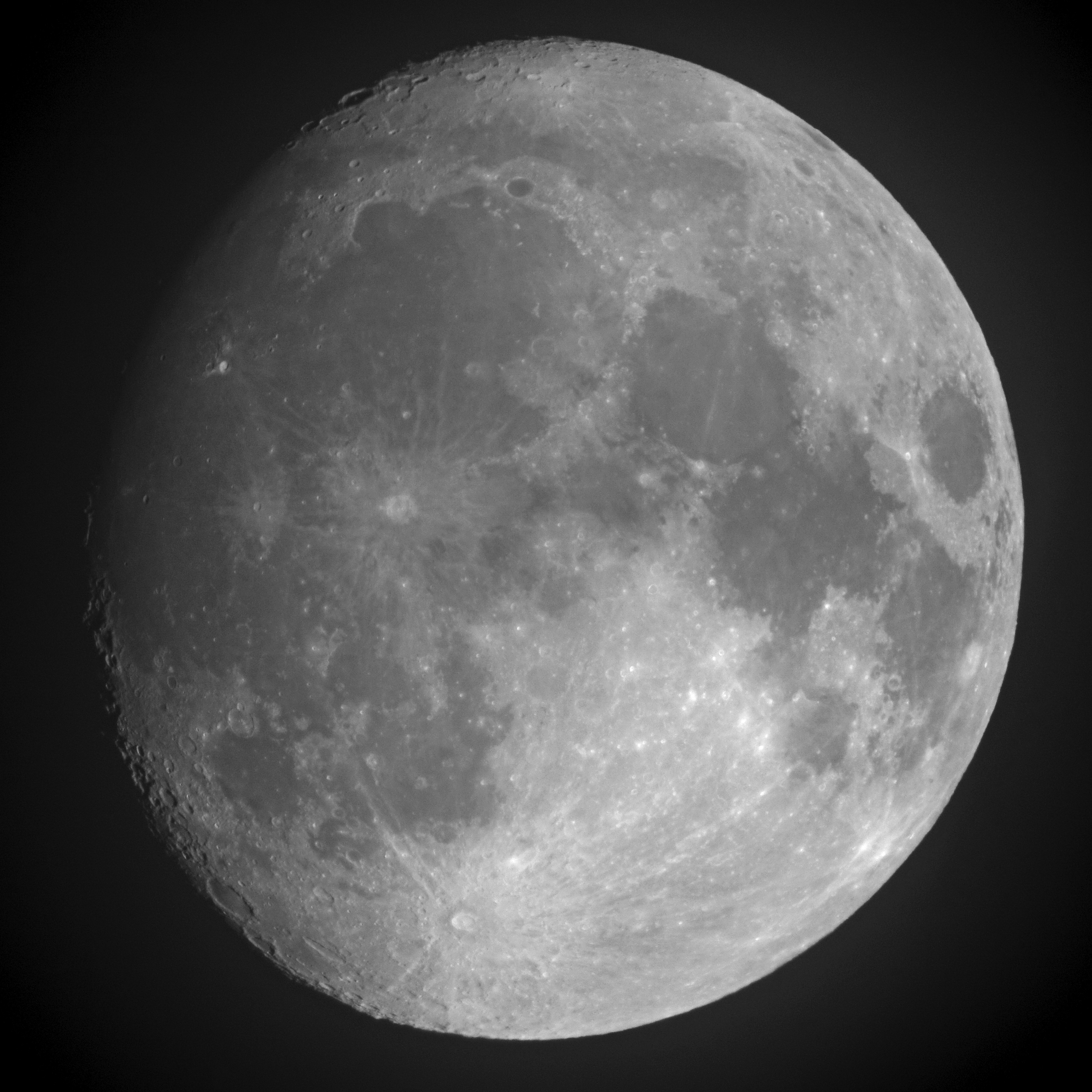 Auf dieser Seite zeige ich Mondfotos, die ich am 20. November 2018 aufgenommen und anschließend bearbeitet habe. Als Teleskop verwendete ich meinen Omegon PS 72/432-Refraktor auf der Sky-Watcher AZ Pronto-Montierung. Ich verwendete mein 32 mm-DigiScope-Okular mit T-Mount mit 3-fach Fokal-Extender, entsprechend einer Vergrößerung von 40,5-fach. Als Kamera diente eine Sony RX100 M4, die ich fest ans 32 mm-Okular schraubte (Projektionsmethode). Belichtet habe ich durchgehend automatisch. Die Entfernung habe ich manuell auf Unendlich gestellt und mit dem Teleskop die Schärfe eingestellt.