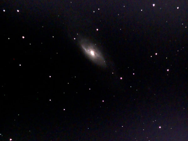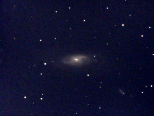 According to Stoyan, the spiral galaxy M 106 (NGC 4258) in the constellation Canes Venatici can be seen in the smallest binoculars and is an easy object for small telescopes. This is probably only true for dark skies, because I had trouble to recognize this object in the telescope at all. For the eVscope, however, this galaxy was not a problem. In addition, on some of my photos I found the small barred spiral galaxy NGC 4248 close to a star.